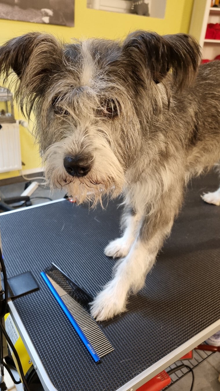 Das ist Gustav, einer der ersten Vierbeiner, den ich in meinen Salon frisieren durfte.